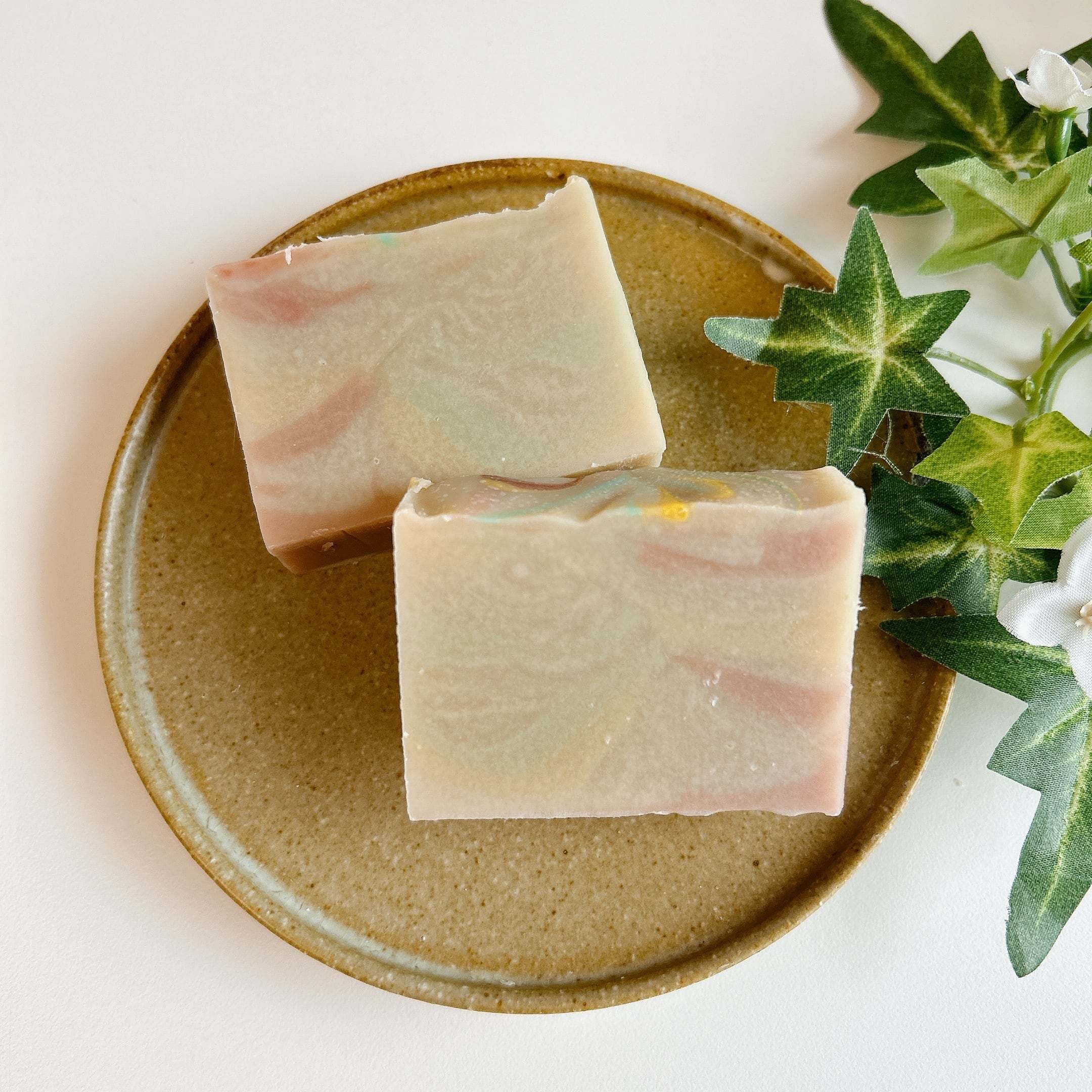 細かな粒子が汚れや老廃物を吸着しながら洗い上げます◎石鹸の素朴な色はクレイの色です(凹凸や黒い粒のようなものはクレイの粒となりますのでそのままご使用いただけます)